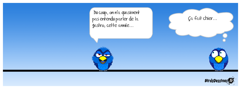Case 1: | Case 2: Bird 1: Du coup, on n'a quasiment pas entendu parler de la gastro, cette année... | Case 3: Bird 1: Ça fait chier...
