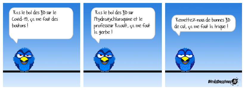 Case 1:Bird 1: Ras le bol des BD sur le Covid-19, ça me fout des boutons ! | Case 2: Bird 1: Ras le bol des BD sur l'hydroxychloroquine et le professeur Raoult, ça me fout la gerbe ! | Case 3: Bird 1: Remettez-nous de bonnes BD de cul, ça me fout la trique !