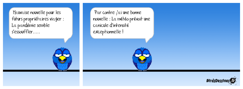 Case 1:Bird 1: Mauvaise nouvelle pour les futurs propriétaires viager : La pandémie semble s'essouffler..... | Case 2: Bird 1: Par contre j'ai une bonne nouvelle : La météo prévoit une canicule d'intensité exceptionnelle ! | Case 3: