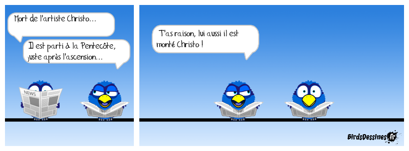 Case 1:Bird 1: Mort de l'artiste Christo... Bird 2: Il est parti à la Pentecôte, juste après l'ascension... | Case 2: Bird 1: T'as raison, lui aussi il est monté Christo ! | Case 3: