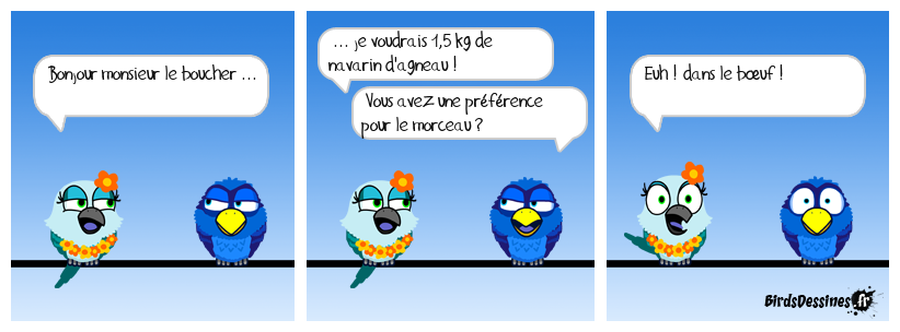 Case 1:Bird 1: Bonjour monsieur le boucher ... | Case 2: Bird 1: ... je voudrais 1,5 kg de navarin d'agneau ! Bird 2: Vous avez une préférence pour le morceau ? | Case 3: Bird 1: Euh ! dans le bœuf !