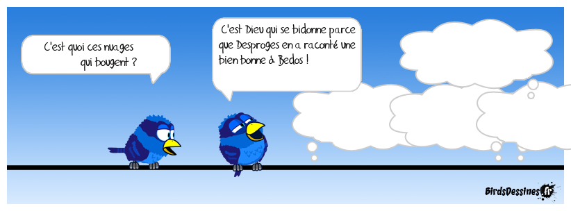 Case 1:Bird 1: C'est quoi ces nuages qui bougent ? | Case 2: Bird 1: C'est Dieu qui se bidonne parce que Desproges en a raconté une bien bonne à Bedos ! | Case 3: