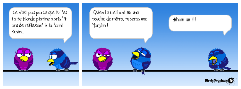 Case 1:Bird 1: Ce n'est pas parce que tu t'es faite blonde platine après "7 ans de réflexion" à la Saint Kevin… | Case 2: Bird 1: Qu'en te mettant sur une bouche de métro, tu seras une Marylin ! | Case 3: Bird 1: Hihihiiiiiii !!!