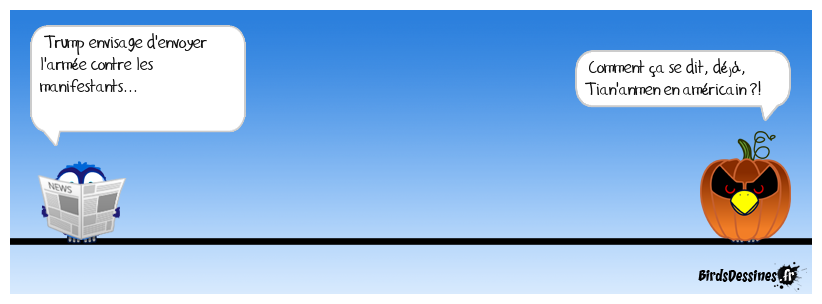 Case 1:Bird 1: Trump envisage d'envoyer l'armée contre les manifestants... | Case 2: | Case 3: Bird 1: Comment ça se dit, déjà, Tian'anmen en américain ?!