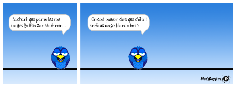 Case 1:Bird 1: Sachant que parmi les rois mages Balthazar était noir... | Case 2: Bird 1: On doit pouvoir dire que c'était un faux mage blanc alors ? | Case 3: