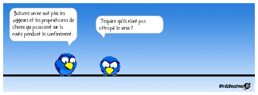 Case 1:Bird 1: Bizarre on ne voit plus les joggeurs et les propriétaires de chiens qui passaient sur la route pendant le confinement. | Case 2: Bird 1: J'espère qu'ils n'ont pas attrapé le virus ? | Case 3: