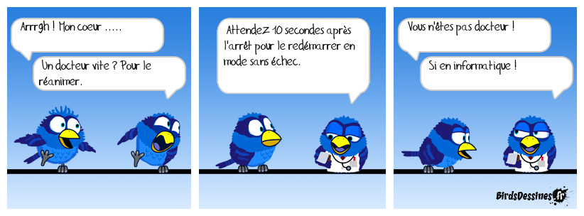 Case 1:Bird 1: Arrrgh ! Mon coeur .....Bird 2: Un docteur vite ? Pour le réanimer. | Case 2: Bird 1: Attendez 10 secondes après l'arrêt pour le redémarrer en mode sans échec. | Case 3: Bird 1: Vous n'êtes pas docteur ! Bird 2: Si en informatique !