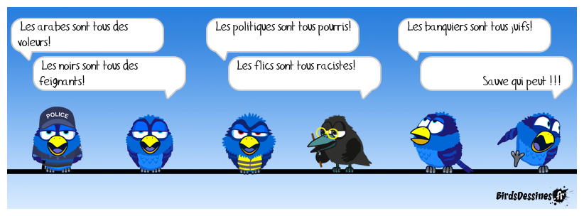 Case 1:Bird 1: Les arabes sont tous des voleurs!Bird 2: Les noirs sont tous des feignants! | Case 2: Bird 1: Les politiques sont tous pourris! Bird 2: Les flics sont tous racistes! | Case 3: Bird 1: Les banquiers sont tous juifs! Bird 2: Sauve qui peut !!!