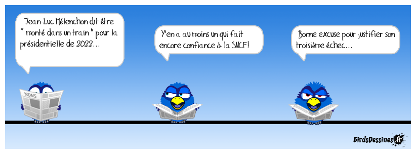 Case 1:Bird 1: Jean-Luc Mélenchon dit être « monté dans un train " pour la présidentielle de 2022... | Case 2: Bird 1: Y'en a au moins un qui fait encore confiance à la SNCF! | Case 3: Bird 1: Bonne excuse pour justifier son troisième échec...