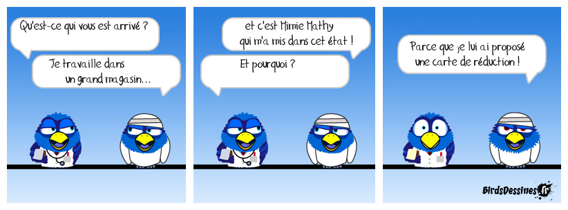 Case 1:Bird 1: Qu'est-ce qui vous est arrivé ?Bird 2: Je travaille dans un grand magasin... | Case 2: Bird 1: et c'est Mimie Mathy qui m'a mis dans cet état ! Bird 2: Et pourquoi ? | Case 3: Bird 1: Parce que je lui ai proposé une carte de réduction !