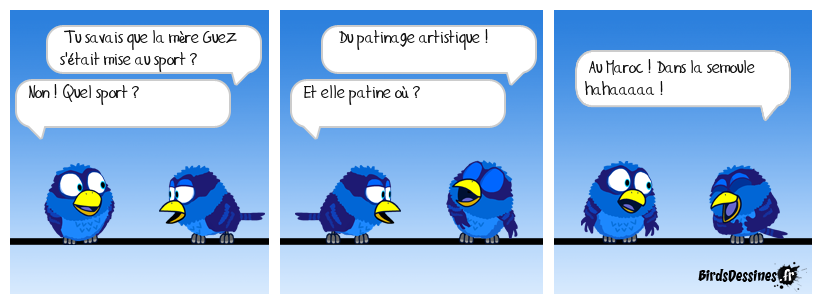Case 1:Bird 1: Tu savais que la mère Guez s'était mise au sport ?Bird 2: Non ! Quel sport ? | Case 2: Bird 1: Du patinage artistique ! Bird 2: Et elle patine où ? | Case 3: Bird 1: Au Maroc ! Dans la semoule hahaaaaa !