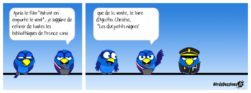 Case 1:Bird 1: Après le film "Autant en emporte le vent", je suggère de retirer de toutes les bibliothèques de France ainsi | Case 2: Bird 1: que de la vente, le livre d'Agatha Christie, "Les dix petits nègres' | Case 3: