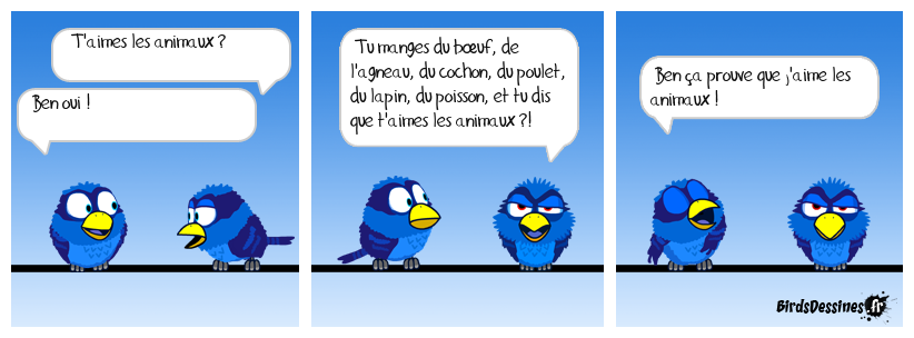 Case 1:Bird 1: T'aimes les animaux ?Bird 2: Ben oui ! | Case 2: Bird 1: Tu manges du bœuf, de l'agneau, du cochon, du poulet, du lapin, du poisson, et tu dis que t'aimes les animaux ?! | Case 3: Bird 1: Ben ça prouve que j'aime les animaux !