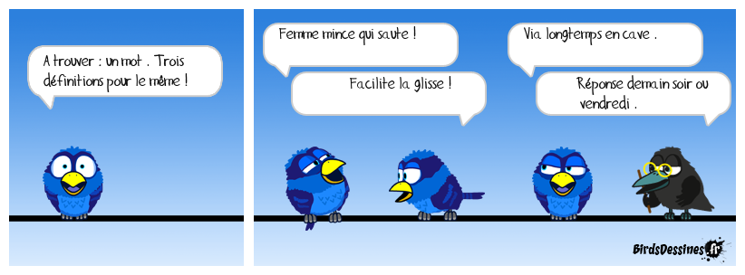 Case 1:Bird 1: A trouver : un mot . Trois définitions pour le même ! | Case 2: Bird 1: Femme mince qui saute ! Bird 2: Facilite la glisse ! | Case 3: Bird 1: Via longtemps en cave . Bird 2: Réponse demain soir ou vendredi .
