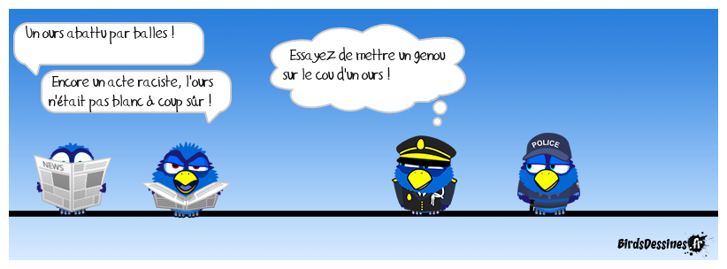 Case 1:Bird 1: Un ours abattu par balles !Bird 2: Encore un acte raciste, l'ours n'était pas blanc à coup sûr ! | Case 2: Bird 1: Essayez de mettre un genou sur le cou d'un ours ! | Case 3: