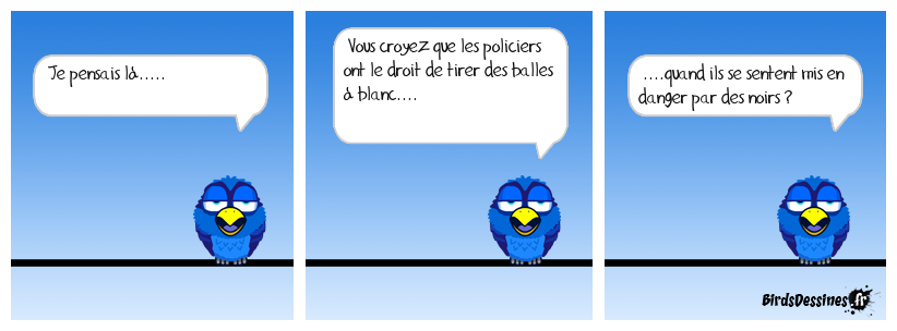 Case 1:Bird 1: Je pensais là..... | Case 2: Bird 1: Vous croyez que les policiers ont le droit de tirer des balles à blanc.... | Case 3: Bird 1: ....quand ils se sentent mis en danger par des noirs ?