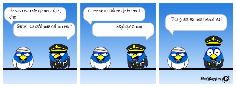 Case 1:Bird 1: Je suis en arrêt de maladie , chef .Bird 2: Qu'est-ce qu'il vous est arrivé ? | Case 2: Bird 1: C' est un accident de travail . Bird 2: Expliquez-moi ! | Case 3: Bird 1: J'ai glissé sur mes menottes !