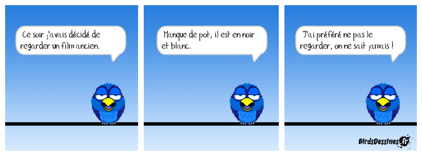 Case 1:Bird 1: Ce soir j'avais décidé de regarder un film ancien. | Case 2: Bird 1: Manque de pot, il est en noir et blanc. | Case 3: Bird 1: J'ai préféré ne pas le regarder, on ne sait jamais !