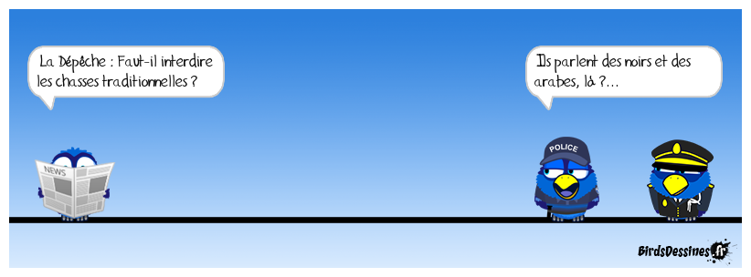 Case 1:Bird 1: La Dépêche : Faut-il interdire les chasses traditionnelles ? | Case 2: | Case 3: Bird 1: Ils parlent des noirs et des arabes, là ?...