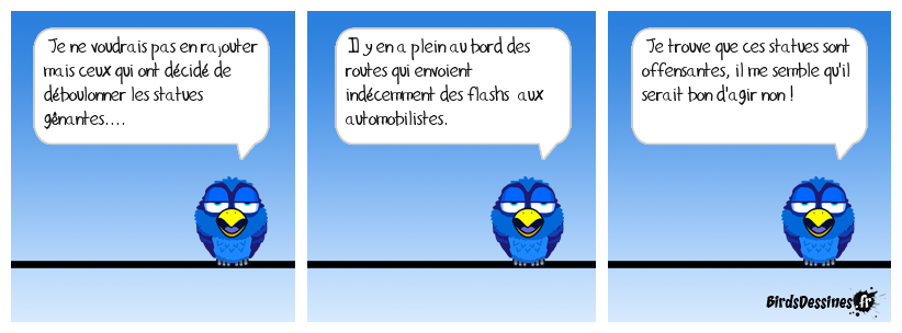 Case 1:Bird 1: Je ne voudrais pas en rajouter mais ceux qui ont décidé de déboulonner les statues gênantes.... | Case 2: Bird 1: Il y en a plein au bord des routes qui envoient indécemment des flashs aux automobilistes. | Case 3: Bird 1: Je trouve que ces statues sont offensantes, il me semble qu'il serait bon d'agir non !