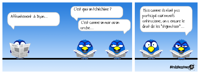 Case 1:Bird 1: Affrontement à Dijon... | Case 2: Bird 1: C'est quoi un tchéchène ? Bird 2: C'est comme un noir ou un arabe... | Case 3: Bird 1: Mais comme ils n'ont pas participé aux manifs antiracisme, on a encore le droit de les "stigmatiser"...