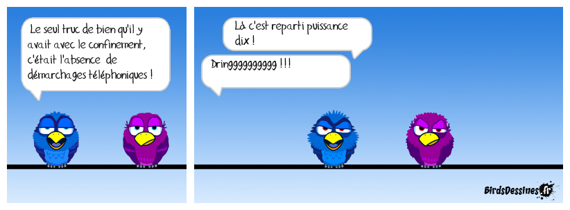 Case 1:Bird 1: Le seul truc de bien qu'il y avait avec le confinement, c'était l'absence de démarchages téléphoniques ! | Case 2: Bird 1: Là c'est reparti puissance dix ! Bird 2: Dringggggggggg !!! | Case 3: