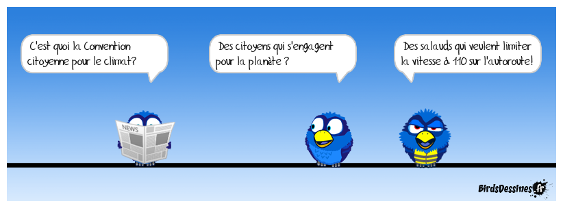 Case 1:Bird 1: C'est quoi la Convention citoyenne pour le climat? | Case 2: Bird 1: Des citoyens qui s'engagent pour la planète ? | Case 3: Bird 1: Des salauds qui veulent limiter la vitesse à 110 sur l'autoroute!