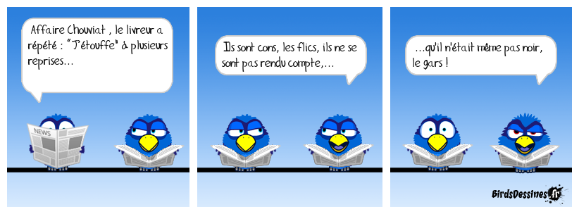 Case 1:Bird 1: Affaire Chouviat , le livreur a répété : «J’étouffe" à plusieurs reprises... | Case 2: Bird 1: Ils sont cons, les flics, ils ne se sont pas rendu compte,... | Case 3: Bird 1: ...qu'il n'était même pas noir, le gars !