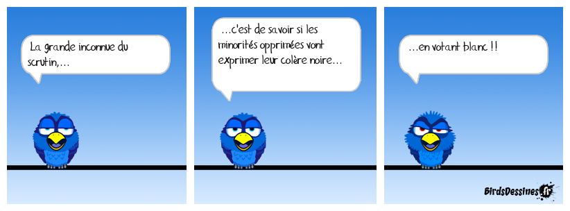 Case 1:Bird 1: La grande inconnue du scrutin,... | Case 2: Bird 1: ...c'est de savoir si les minorités opprimées vont exprimer leur colère noire... | Case 3: Bird 1: ...en votant blanc !!