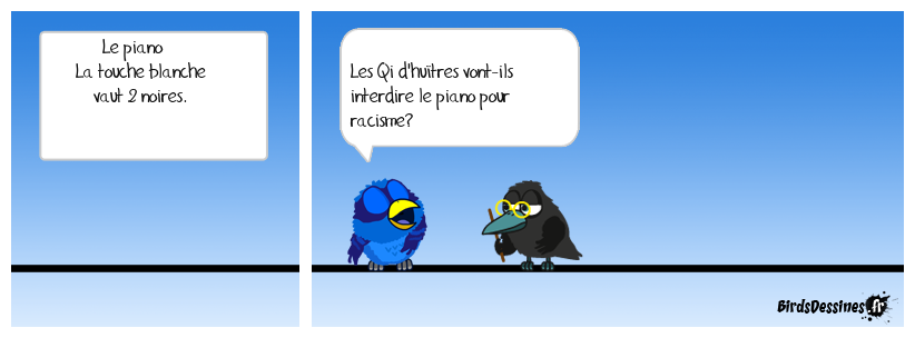 Case 1:Bird 1: Le piano La touche blanche vaut 2 noires. | Case 2: Bird 1: Les Qi d'huîtres vont-ils interdire le piano pour racisme? | Case 3: