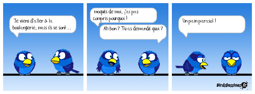 Case 1:Bird 1: Je viens d'aller à la boulangerie, mais ils se sont... | Case 2: Bird 1: moqués de moi, j'ai pas compris pourquoi ! Bird 2: Ah bon ? Tu as demandé quoi ? | Case 3: Bird 1: Un pain parasol !