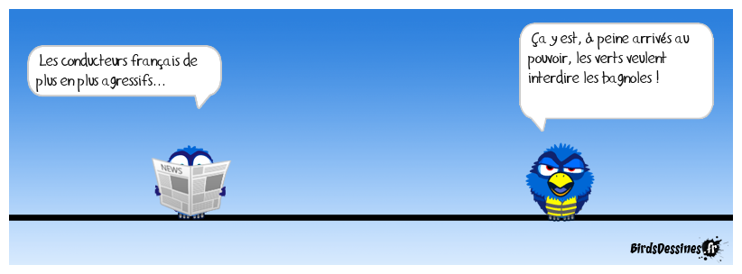 Case 1:Bird 1: Les conducteurs français de plus en plus agressifs... | Case 2: | Case 3: Bird 1: Ça y est, à peine arrivés au pouvoir, les verts veulent interdire les bagnoles !