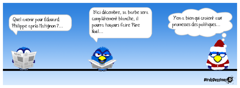 Case 1:Bird 1: Quel avenir pour Édouard Philippe après Matignon ?... | Case 2: Bird 1: D'ici décembre, sa barbe sera complètement blanche, il pourra toujours faire Père Noël... | Case 3: Bird 1: Y'en a bien qui croient aux promesses des politiques...