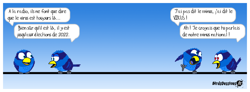 Case 1:Bird 1: A la radio, ils ne font que dire que le virus est toujours là...Bird 2: Bien sûr qu'il est là, il y est jusqu'aux élections de 2022. | Case 2: | Case 3: Bird 1: J'ai pas dit le minus, j'ai dit le VIRUS ! Bird 2: Ah ! Je croyais que tu parlais de notre minus national !