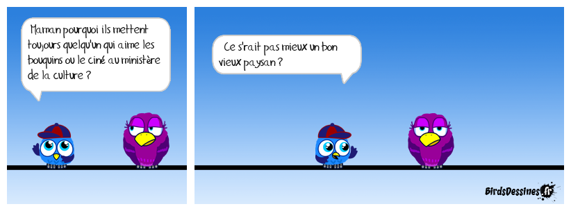 Case 1:Bird 1: Maman pourquoi ils mettent toujours quelqu'un qui aime les bouquins ou le ciné au ministère de la culture ? | Case 2: Bird 1: Ce s'rait pas mieux un bon vieux paysan ? | Case 3: