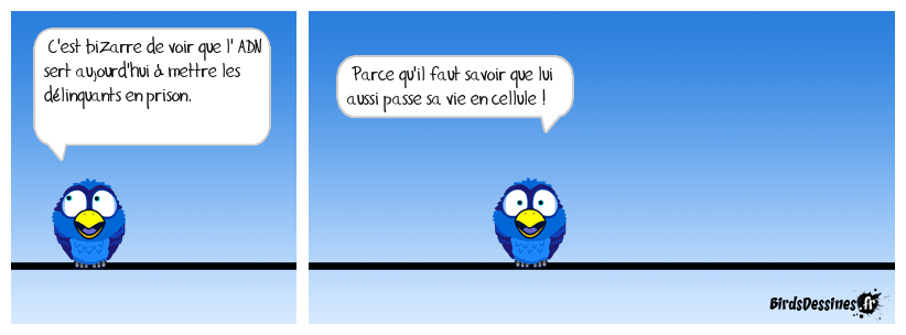 Case 1:Bird 1: C'est bizarre de voir que l' ADN sert aujourd'hui à mettre les délinquants en prison. | Case 2: Bird 1: Parce qu'il faut savoir que lui aussi passe sa vie en cellule ! | Case 3: