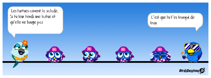 Case 1:Bird 1: Les tortues aiment la salade. Si tu leur tends une laitue et qu’elle ne bouge pas | Case 2: | Case 3: Bird 1: C’est que tu t’es trompé de trou