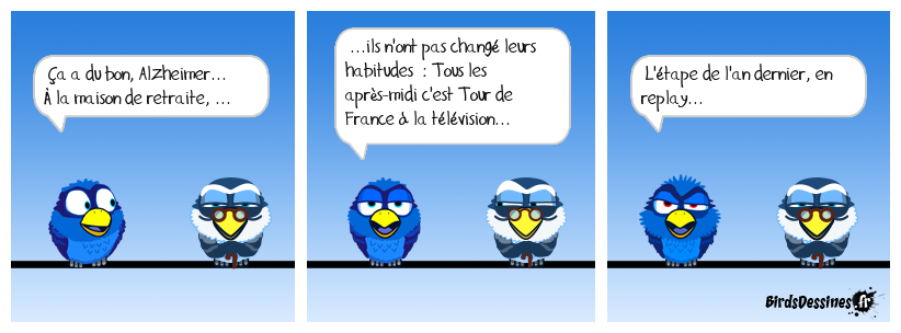 Case 1:Bird 1: Ça a du bon, Alzheimer... À la maison de retraite, ... | Case 2: Bird 1: ...ils n'ont pas changé leurs habitudes : Tous les après-midi c'est Tour de France à la télévision... | Case 3: Bird 1: L'étape de l'an dernier, en replay...