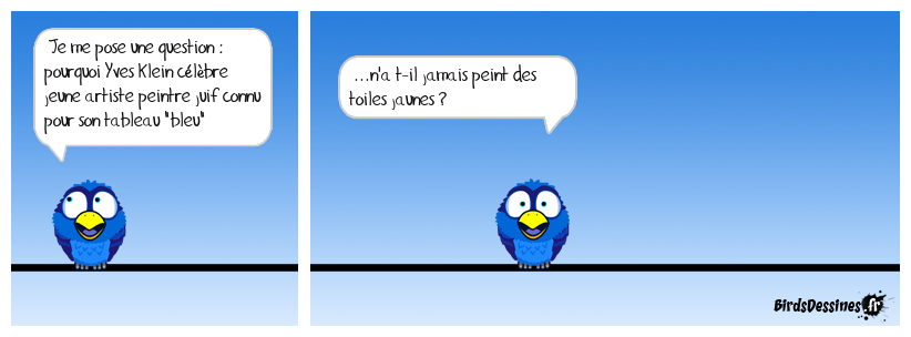Case 1:Bird 1: Je me pose une question : pourquoi Yves Klein célèbre jeune artiste peintre juif connu pour son tableau "bleu" | Case 2: Bird 1: ...n'a t-il jamais peint des toiles jaunes ? | Case 3: