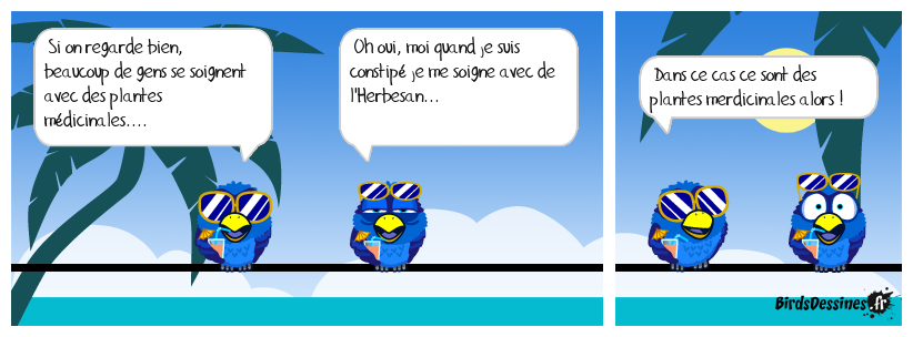 Case 1:Bird 1: Si on regarde bien, beaucoup de gens se soignent avec des plantes médicinales.... | Case 2: Bird 1: Oh oui, moi quand je suis constipé je me soigne avec de l'Herbesan... | Case 3: Bird 1: Dans ce cas ce sont des plantes merdicinales alors !