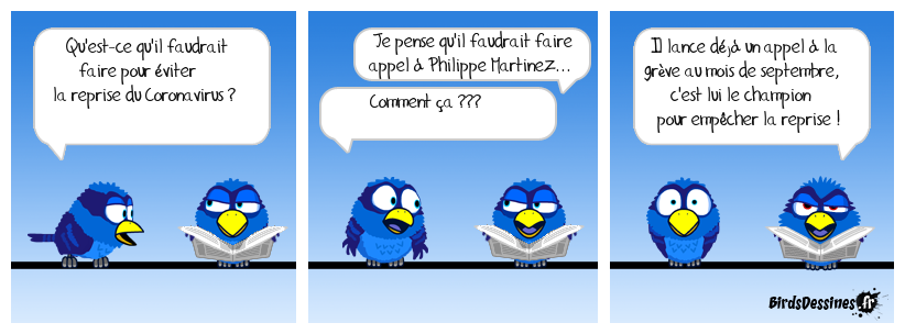 Case 1:Bird 1: Qu'est-ce qu'il faudrait faire pour éviter la reprise du Coronavirus ? | Case 2: Bird 1: Je pense qu'il faudrait faire appel à Philippe Martinez... Bird 2: Comment ça ??? | Case 3: Bird 1: Il lance déjà un appel à la grève au mois de septembre, c'est lui le champion pour empêcher la reprise !