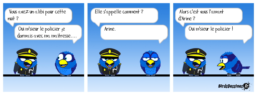 Case 1:Bird 1: Vous avez un alibi pour cette nuit ? Bird 2: Oui m'sieur le policier je dormais avec ma maîtresse.... | Case 2: Bird 1: Elle s'appelle comment ? Bird 2: Arine. | Case 3: Bird 1: Alors c'est vous l'amant d'Arine ? Bird 2: Oui m'sieur le policier !