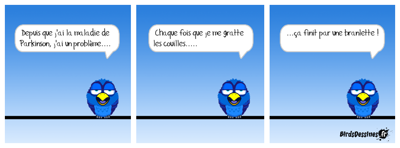 Case 1:Bird 1: Depuis que j'ai la maladie de Parkinson, j'ai un problème.... | Case 2: Bird 1: Chaque fois que je me gratte les couilles..... | Case 3: Bird 1: ...ça finit par une branlette !