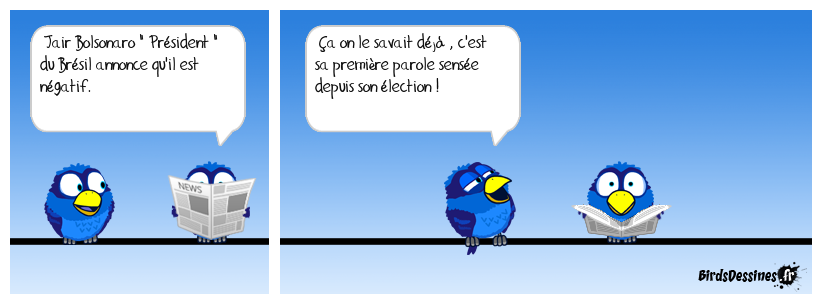 Case 1:Bird 1: Jair Bolsonaro " Président " du Brésil annonce qu'il est négatif. | Case 2: Bird 1: Ça on le savait déjà , c'est sa première parole sensée depuis son élection ! | Case 3:
