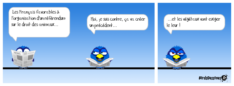 Case 1:Bird 1: Les Français favorables à l'organisation d'un référendum sur le droit des animaux... | Case 2: Bird 1: Moi, je suis contre, ça va créer un précédent... | Case 3: Bird 1: ...et les végétaux vont exiger le leur !