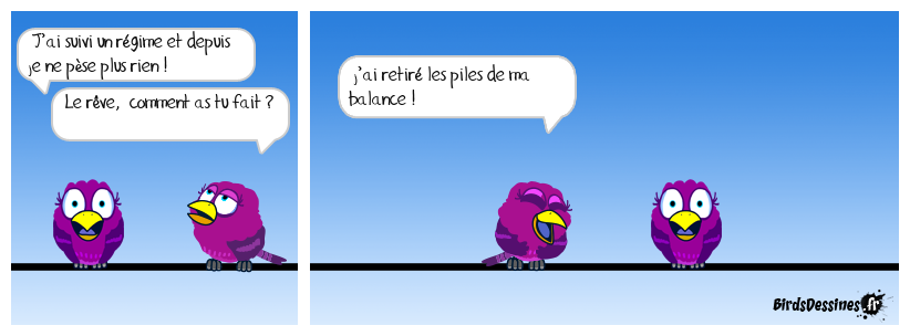Case 1:Bird 1: J’ai suivi un régime et depuis je ne pèse plus rien !Bird 2: Le rêve, comment as tu fait ? | Case 2: Bird 1: j’ai retiré les piles de ma balance ! | Case 3: