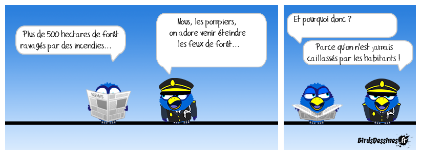 Case 1:Bird 1: Plus de 500 hectares de forêt ravagés par des incendies... | Case 2: Bird 1: Nous, les pompiers, on adore venir éteindre les feux de forêt... | Case 3: Bird 1: Et pourquoi donc ? Bird 2: Parce qu'on n'est jamais caillassés par les habitants !