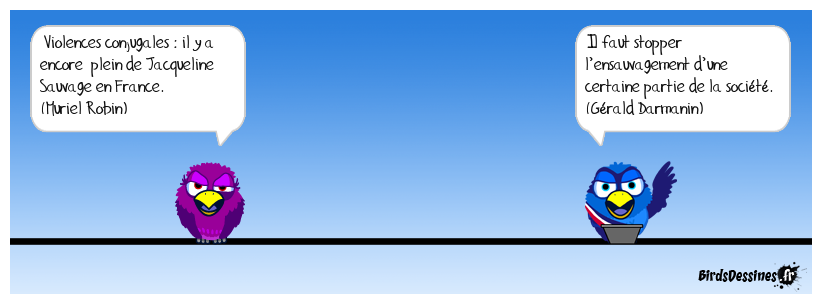 Case 1:Bird 1: Violences conjugales : il y a encore plein de Jacqueline Sauvage en France. (Muriel Robin) | Case 2: | Case 3: Bird 1: Il faut stopper l’ensauvagement d’une certaine partie de la société. (Gérald Darmanin)