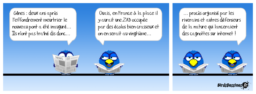 Case 1:Bird 1: Gênes : deux ans après l'effondrement meurtrier le nouveau pont a été inauguré... Ils n'ont pas traïné dis donc... | Case 2: Bird 1: Ouais, en France à la place il y aurait une ZAD occupée par des écolos bien crasseux et on en serait au vingtième... Bird 2: Tu parles chez nous à la place il y aurait une ZAD occupée par | Case 3: Bird 1: ... procès organisé par les riverains et autres défenseurs de la nature qui lanceraient des cagnottes sur internet !