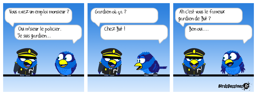 Case 1:Bird 1: Vous avez un emploi monsieur ? Bird 2: Oui m'sieur le policier. Je suis gardien... | Case 2: Bird 1: Gardien où ça ? Bird 2: Chez But ! | Case 3: Bird 1: Ah c'est vous le fameux gardien de But ? Bird 2: Ben oui....